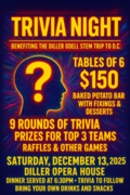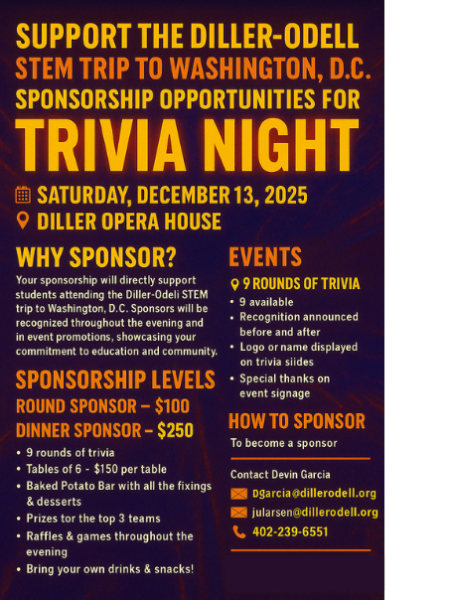 The Diller-Odell STEM Club will be hosting a trivia night on Saturday, Dec. 13th, at the Opera House in Diller. Diller will begin at 6:00 PM, with trivia to begin at 7 PM. If you would like to be a round sponsor, dinner sponsor, or enter a team, please contact Devin Garcia (dgarcia @dillerodell.org) or Justin Larsen (jularsen@dillerodell.org). This event is to help raise money for the STEM Club trip to Washington, DC, this coming May 2026.